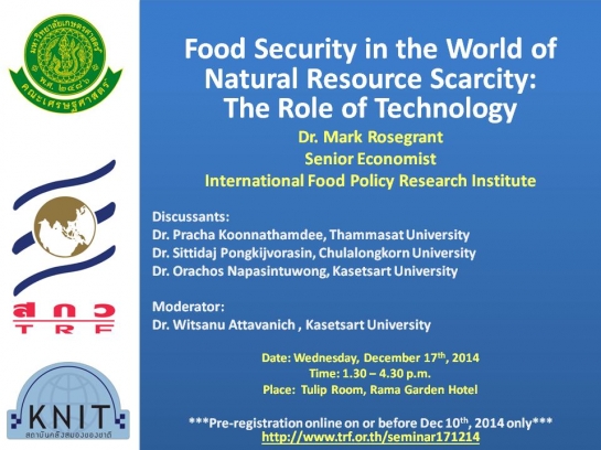 เรื่อง “Food Security in the World of Natural Resource Scarcity: The Role of Technology” โดย Dr. Mark W. Rosegrant จาก International Food Policy Research institute (IFPRI), USA วันที่ ...